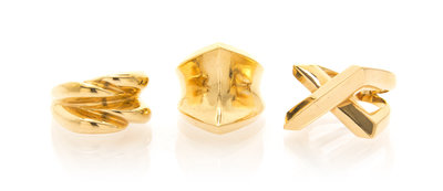 consisting of an "X" shape ring, a double bypass motif ring and a pointed convex dome ring.Stamp: 14K.