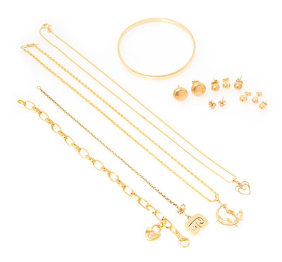 containing five pairs of yellow gold bead earrings, a 14 karat gold bangle, an 18 karat gold pendant containing one round brilliant cut diamond weighing approximately 0.07 carat, an 18 karat gold moon pendant on chain, an 18 karat gold and diamond heart charm bracelet containing four round brilliant cut diamonds, measuring approximately 0.04 carat total, a 14 karat gold bracelet with an 18 karat gold charm, a link bracelet with lobster clasp, measuring 7 3/8 inches in length, with an attached charm.