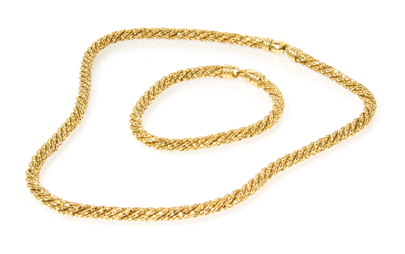 consisting of a twisted multistrand popcorn link necklace and matching bracelet.Stamp: 750 (Italian hallmarks).