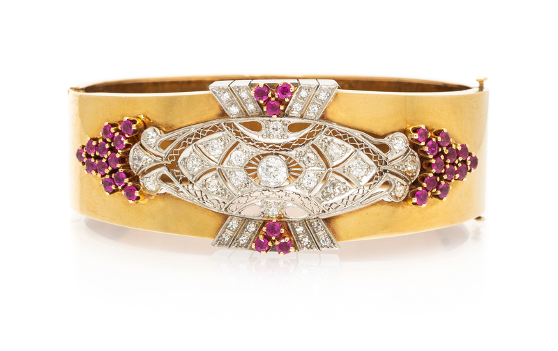 comprised of a central platinum openwork brooch which has been shaped to fit within the gold bracelet base, containing a central bezel set old European cut diamond weighing approximately 0.23 carat total, 32 old European and round cut diamonds weighing approximately 0.80 carat total and 30 round mixed cut rubies weighing approximately 1.72 carats total, hinged base.