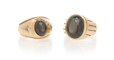 consisting of a 14 karat gold ring containing one oval cabochon cut black star sapphire measuring approximately 9.63 x 7.63 x 6.87 mm and two old European cut diamonds weighing approximately 0.10 carat total, together with a gold ring containing one oval black star sapphire measuring approximately 13.68 x 10.43 x 7.68 mm.