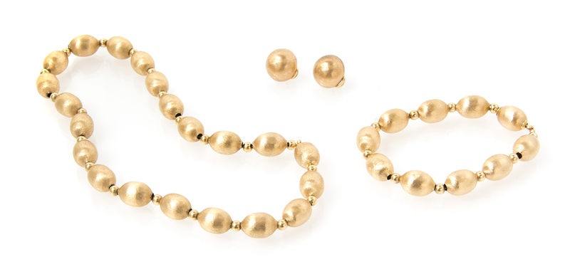 consisting of a matching necklace, bracelet and pair of earclips containing numerous polished gold beads alternating with oval shaped beads with a Florentine finish, strung on chain.
