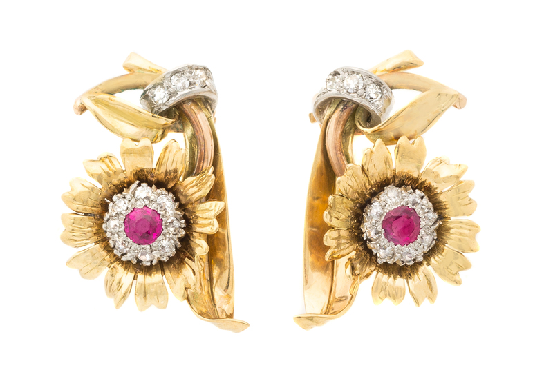 A Pair of Retro Tricolor Gold, Ruby and Diamond Flower Earclips,