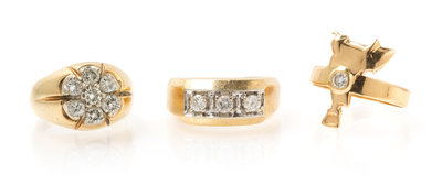 consisting of ring containing three round brilliant cut diamonds weighing approximately 0.51 carat total, a horse saddle motif ring containing one round brilliant cut diamond weighing approximately 0.09 carat and one ring containing seven round brilliant cut diamonds weighing approximately 0.83 carat total. Stamp: 14K.