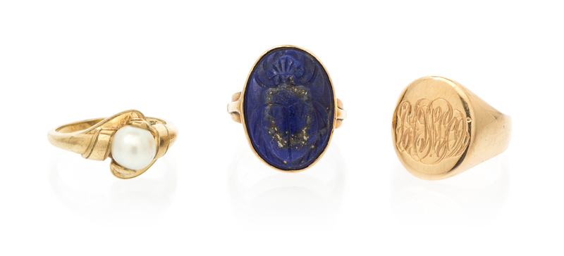 consisting of a 14 karat gold signet ring, a 10 karat gold ring containing one pearl measuring 6.97 mm in diameter and a 14 karat gold lapis lazuli scarab ring.