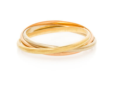 consisting of three interlocking yellow, white and rose gold bangles. Stamp: 14Kt Italy AGS.