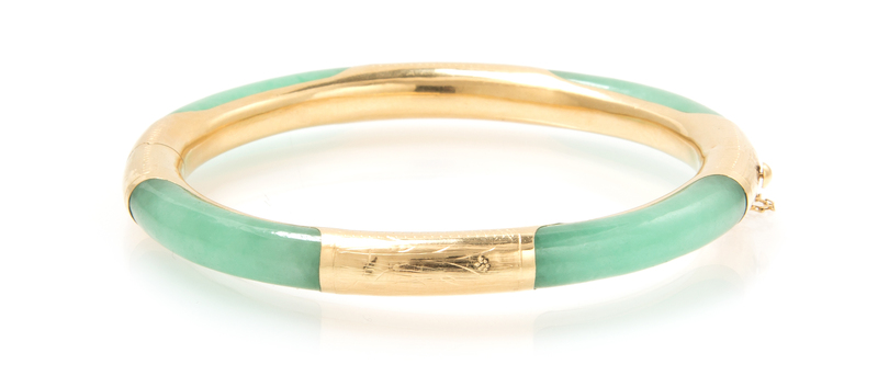A 14 Karat Yellow Gold and Jade Bangle,