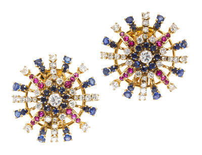 A Pair of Yellow Gold, Diamond, Sapphire and Ruby Earclips,