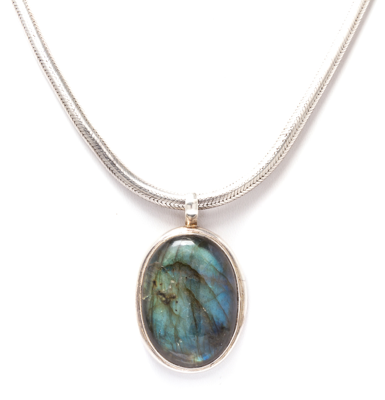 consisting of a pendant containing one oval cabochon cut laboradite measuring approximately 41.00 x 29.00 mm, suspended from a silver snake chain necklace.