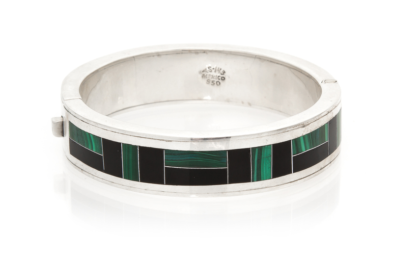 A Mexican Silver, Onyx and Malachite Bangle Bracelet, Mexico,
