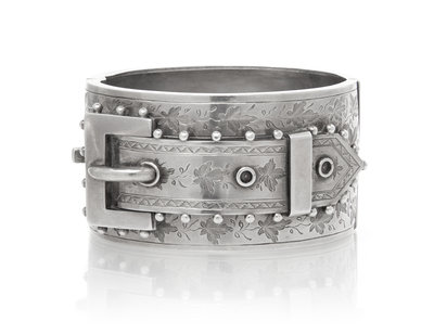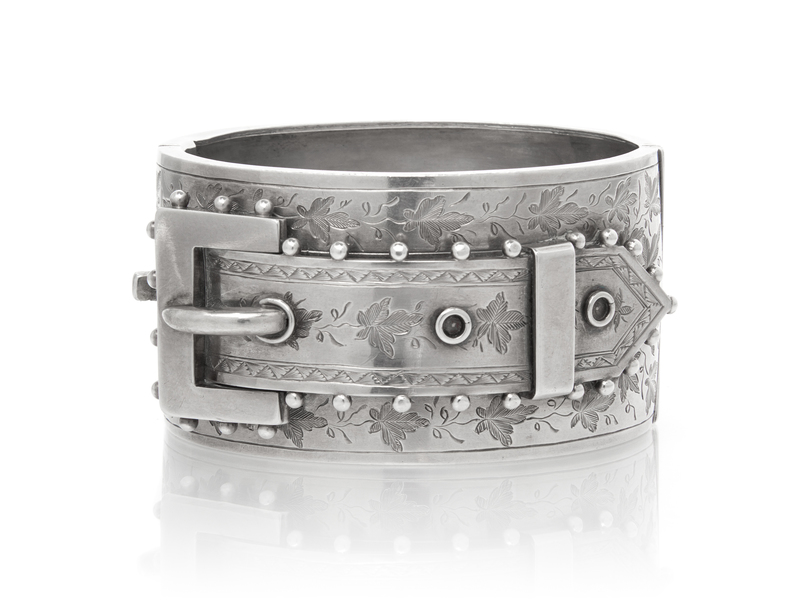 measuring approximately 38.00 mm in width, with an engraved leaf pattern and raised dimensional belt motif, hinged clasp.Stamp: Sterling Silver.