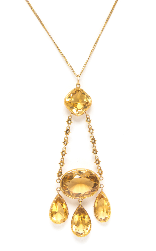 containing one oval mixed cut citrine, three pear shape mixed cut citrines, one square mixed cut citrine and numerous seed pearls, suspended from a later yellow gold chain.