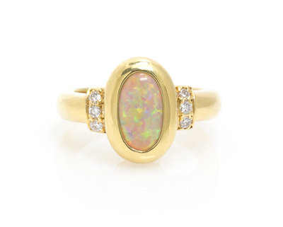 containing one oval cabochon cut opal weighing approximately 1.60 carats and six round brilliant cut diamonds weighing approximately 0.12 carat total.Stamp: 18K.Engraved: JBI.