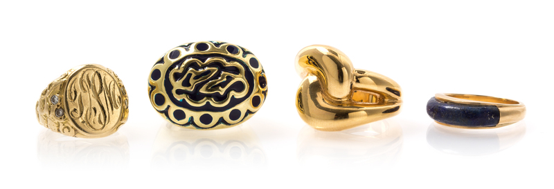 consisting of a knot motif ring, a lapis lazuli ring, a hollowform ring with black enamel work and a signet ring engraved DPH containing four round brilliant cut diamonds weighing approximately 0.14 carat total.