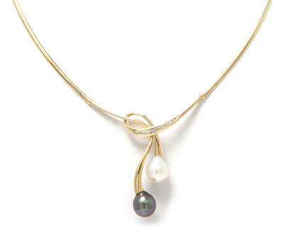 consisting of an omega style necklace with crossed center containing 11 round brilliant cut diamonds weighing approximately 0.16 carat total, one baroque cream colored pearl measuring approximately 10.65 mm in diameter and one South Sea pearl measuring approximately 10.24 mm in diameter. Stamp: 585.