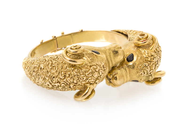 An 18 Karat Yellow Gold and Sapphire Ram's Head Bypass Bangle, J Rossi,