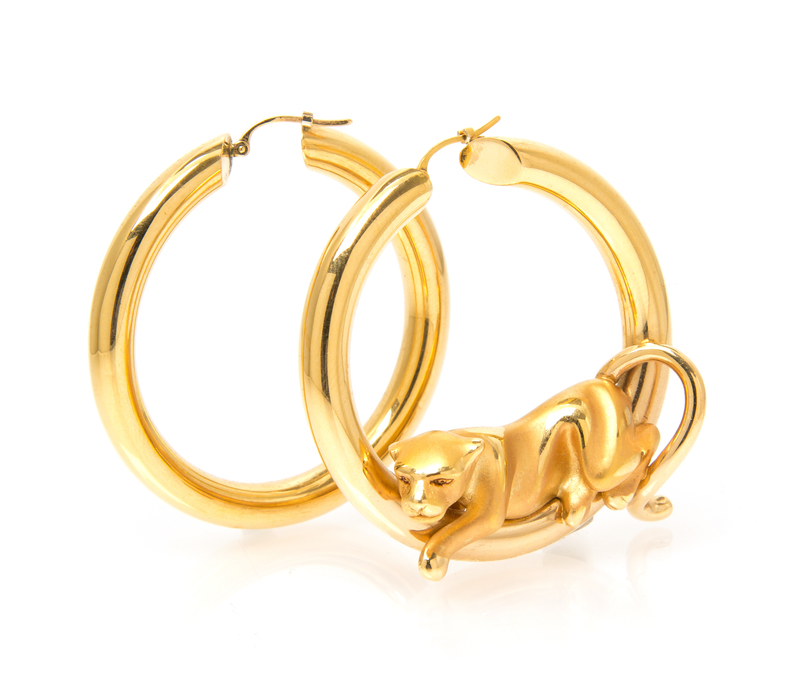 with a reclining panther on one hoop earring.Stamp: 18K C.