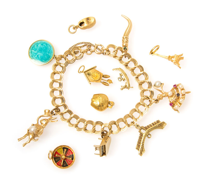 A 14 Karat Yellow Gold Charm Bracelet with 12 Attached and Unattached Charms,