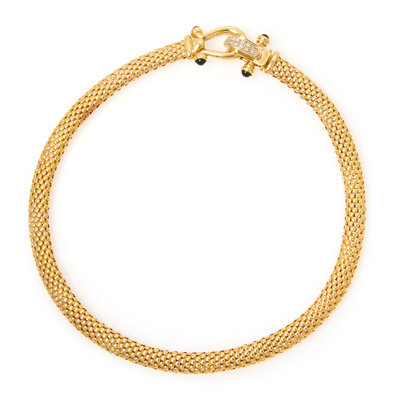 consisting of a popcorn link necklace measuring approximately 6.00 mm in width, with a clasp containing 14 round brilliant cut diamonds and four round cabochon cut onyx measuring approximately 4.38-4.51 mm in diameter. Stamp: 14K (makers mark for Ross Simmons).