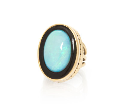 containing one oval cabochon cut opal measuring 12.15 x 13.24 mm set within a ring of onyx.