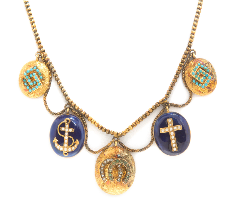 consisting of three intricately engraved oval pendants and two oval pendants accented with blue enamel, each pendant is surmounted with a raised gem set section depicting interlocking squares, an anchor, a cross and a pair of horseshoes containing round cabochon cut turquoise, seed pearls, rose cut diamonds and oval mixed cut emeralds, pendants are suspended from a beaded link chain with mesh chain swag detail.