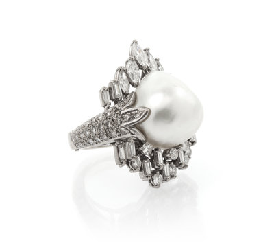 in an asymmetric design, containing one baroque pearl measuring approximately 16.20 x 15.65 x 13.30 mm, five marquise cut diamonds weighing approximately 0.47 carat total, 14 baguette cut diamonds weighing approximately 0.56 carat total and 37 round brilliant cut diamonds weighing approximately 0.84 carat total.