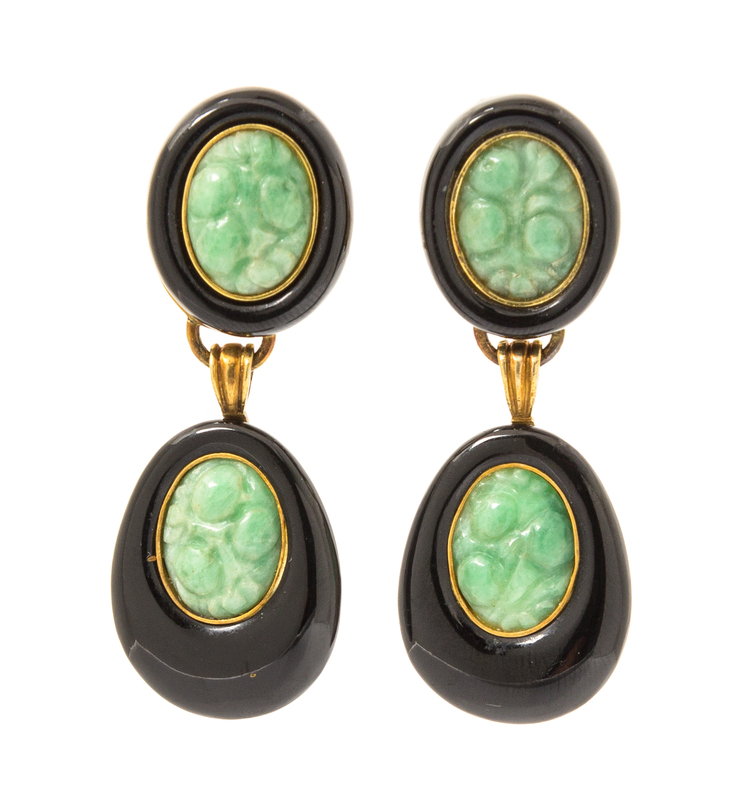 A Pair of 18 Karat Yellow Gold, Jade and Onyx Pendant Earclips, Trio,