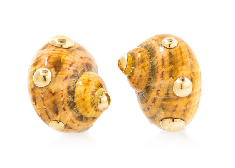 consisting of two shells measuring approximately 25.00 x 20.00 mm with applied gold dome accents.Stamp: 14K MAZ.
