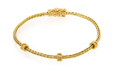 consisting of a woven wheat chain with three station beads and clasp with applied granulation designs.Stamp: 585.