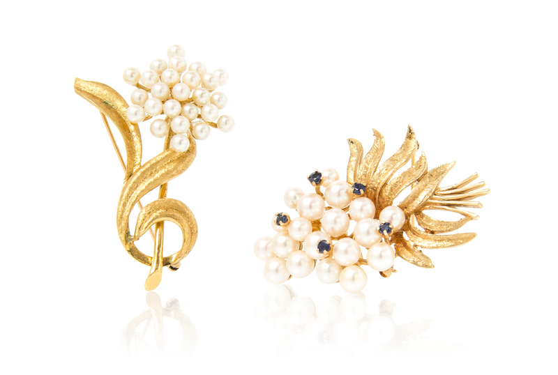 consisting of a brooch in a floral motif with Florentine finish containing 25 pearls measuring approximately 3.71-4.02 mm diameter and a grape motif brooch with Florentine finish containing 19 cultured pearls measuring approximately 4.36-5.61 mm in diameter and five round mixed cut sapphires measuring approximately 2.90 mm each in diameter.Stamp: 14K.