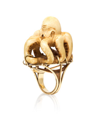 A 14 Karat Yellow Gold and Ox Bone Octopus Netsuke Ring, Bensabott,