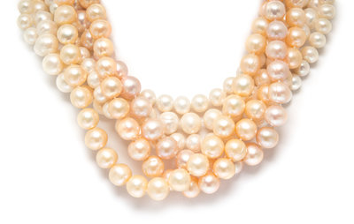consisting of three double strand knotted pearl necklaces in shades of white, pale pink and pale peach with white gold tone clasps, together with four single strand knotted pearl necklace in shades of white, pale pink and pale peach with yellow gold tone clasps.