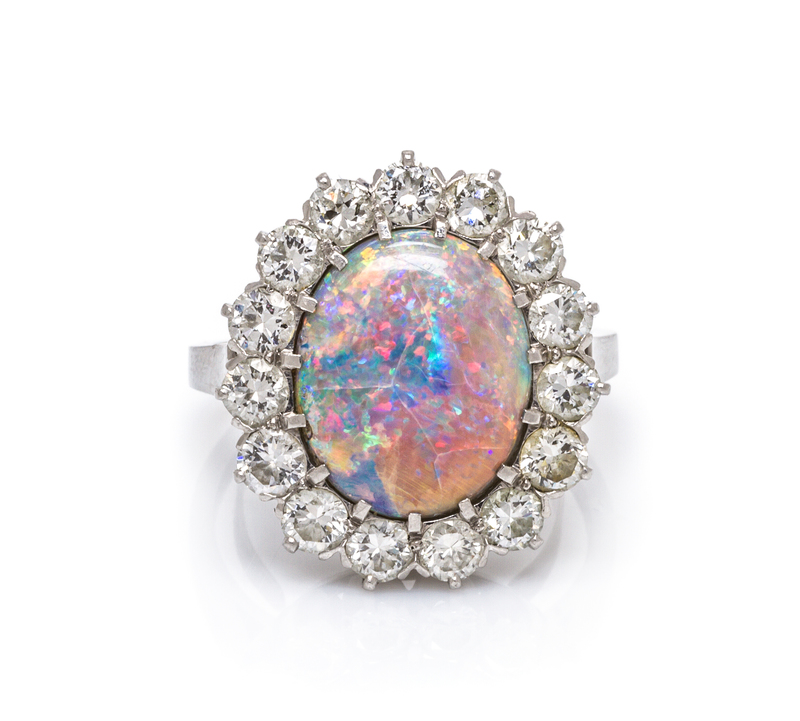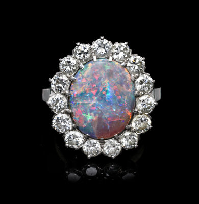 containing one oval cabochon cut grey base opal measuring approximately 12.35 x 10.35 x 3.70 mm and 15 round brilliant cut diamonds weighing approximately 1.65 carats total.Stamp: PLAT IRID.