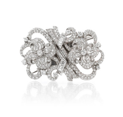 in an intricate mirror image openwork design, containing ten round brilliant cut diamonds weighing approximately 1.00 carat total, 12 baguette cut diamonds weighing approximately 0.72 carat total and numerous round single cut diamonds weighing approximately 2.75 carats total.