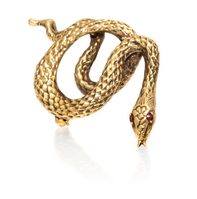 with a textured scale motif finish, containing two round mixed cut ruby eyes.