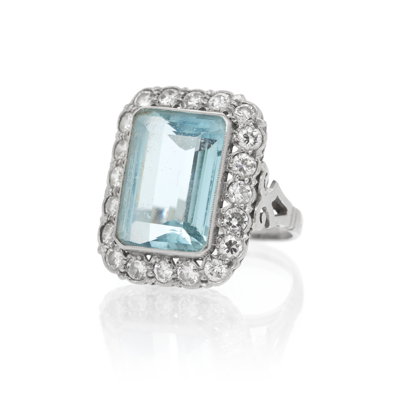 consisting of one bezel set octagonal step cut aquamarine measuring approximately 16.80 x 12.32 x 7.38 mm within an openwork border containing 20 round brilliant cut diamonds weighing approximately 1.27 carats total, filigree shoulders.