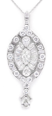 containing numerous stones including one marquise shape brilliant cut diamond weighing approximately 1.15 carats, four marquise shape brilliant cut diamonds weighing approximately 0.60 carat total, one pear shape brilliant cut diamond weighing approximately 1.02 carats, two pear shape brilliant cut diamonds weighing approximately 1.00 carat total, 14 round brilliant cut diamonds weighing approximately 2.40 carats total, 28 baguette cut diamonds weighing approximately 1.80 carats total and one triangular step cut diamond weighing approximately 0.02 carat total, suspended from a white gold cable link chain.