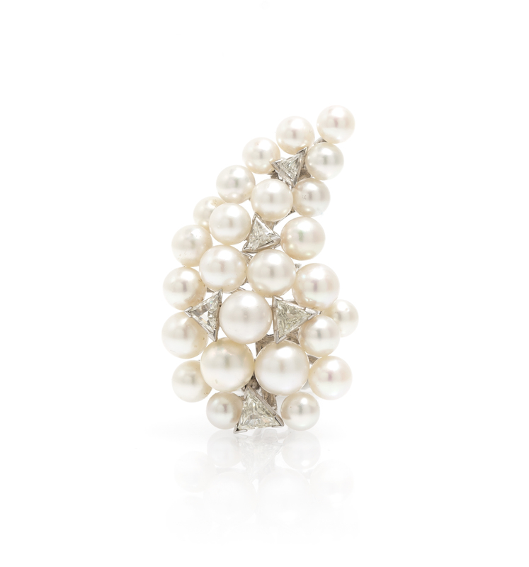 of crescent form, consisting of 25 pearls measuring approximately 5.40-7.15 mm in diameter together with five triangular step cut diamonds weighing approximately 1.65 carats total.