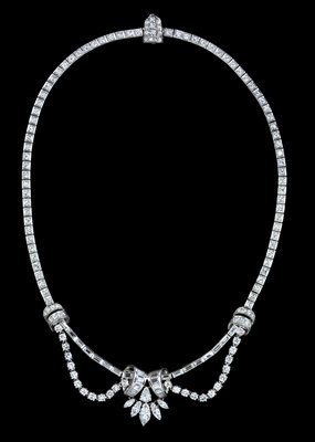 containing numerous round brilliant cut diamonds weighing approximately 5.40 carats total, 32 baguette cut diamonds weighing approximately 1.40 carats total, five marquise shape brilliant cut diamonds weighing approximately 1.35 carats total and one pear shape brilliant cut diamond weighing approximately 0.42 carat. Stamp: .900 PLAT .100 IRID.
