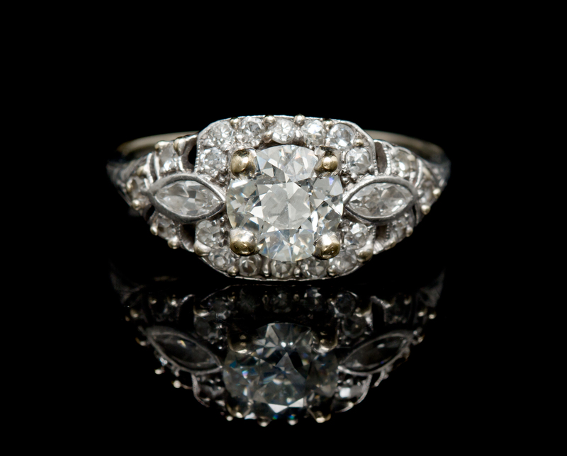 in an openwork setting containing one old European cut diamond weighing approximately 0.95 carat, two marquise cut diamonds weighing approximately 0.20 carat total and 20 round single cut diamonds weighing approximately 0.25 carat total.