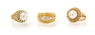 consisting of a 14 karat yellow gold and cultured pearl ring set with one pearl measuring approximately 9.90 mm in diameter surrounded by open wirework in a rope design and a rope design shank, an 18 karat yellow gold and diamond ring in a domed rope design containing five round single cut diamonds and five round brilliant cut diamonds weighing approximately 0.34 carat total, and a 14 karat yellow gold ring containing one cultured pearl measuring approximately 9.18 mm in diameter surrounded by 14 round single cut diamonds weighing approximately 0.42 carat total.