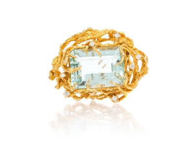 containing an octagonal step cut aquamarine measuring approximately 24.20 x 18.05 x 10.99 mm and seven round brilliant cut diamonds weighing approximately 0.35 carat total within a textured wirework setting.