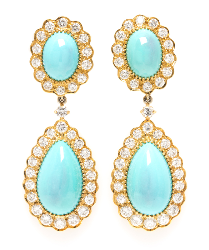 A Pair of Yellow Gold, Turquoise and Diamond Pendant Convertible Earclips,