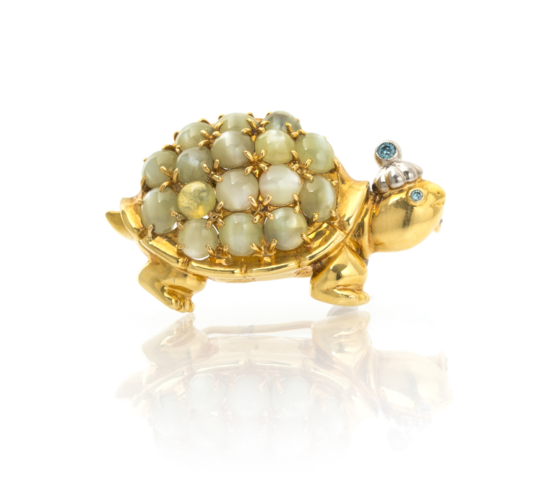 An 18 Karat Yellow Gold, Platinum, Cat's Eye Chrysoberyl and Irradiated Color Diamond Turtle Brooch,