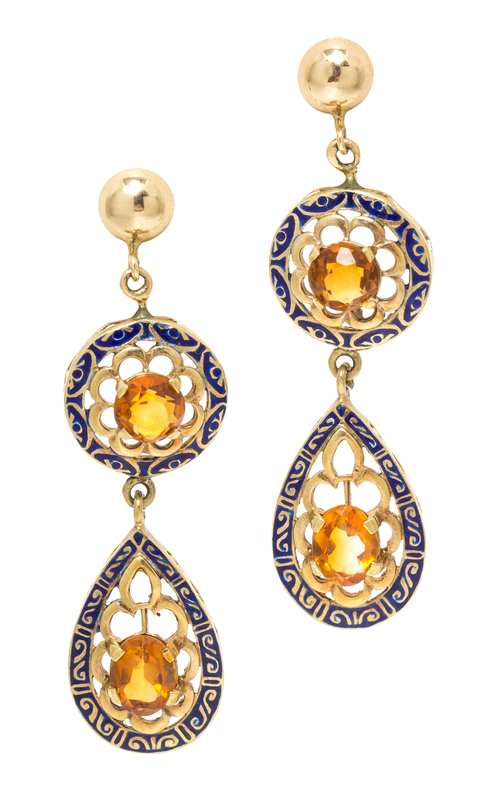 in a drop design, containing two oval mixed cut and two round mixed cut citrines within blue enamel accented openwork settings.Stamp: 14K.