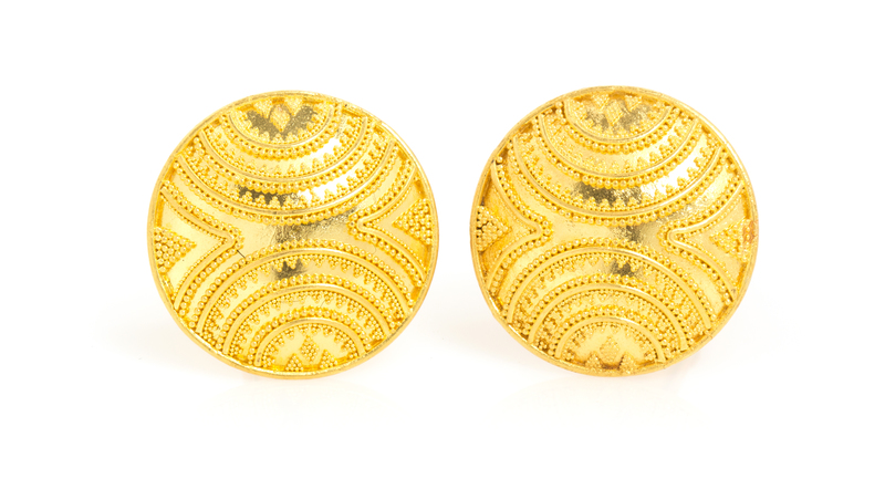 consisting of a domed circular base accented with authentic applied granulated details forming a complex semi circular pattern, 18 karat yellow gold hinged cufflink fittings.Stamp: 22K 18K (maker's mark).