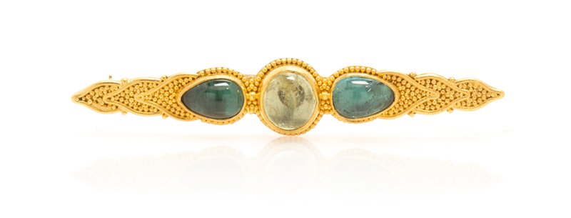 containing one oval cabochon cut green beryl and two pear shape cabochon cut greenish blue tourmaline within the repeated leaf design setting accented with authentic applied granulation detail, 18 karat yellow gold backing and brooch fittings.Stamp: 22K 18K (maker's mark).