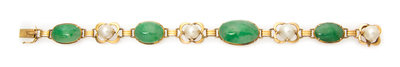 A Vintage Yellow Gold, Jadeite and Cultured Pearl Bracelet, Hong Kong,