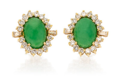 A Pair of 18 Karat Yellow Gold, Jadeite and Diamond Earclips,