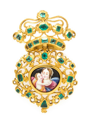 An Antique Yellow Gold, Emerald and Polychrome Enamel Madonna and Child Pendant,